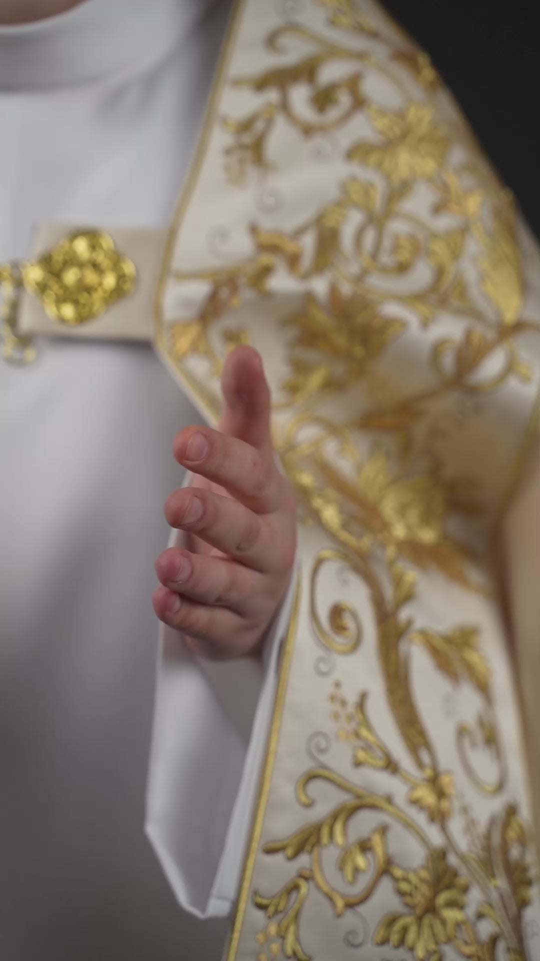 - Bordado decorativo com o símbolo litúrgico do IHS e flores.