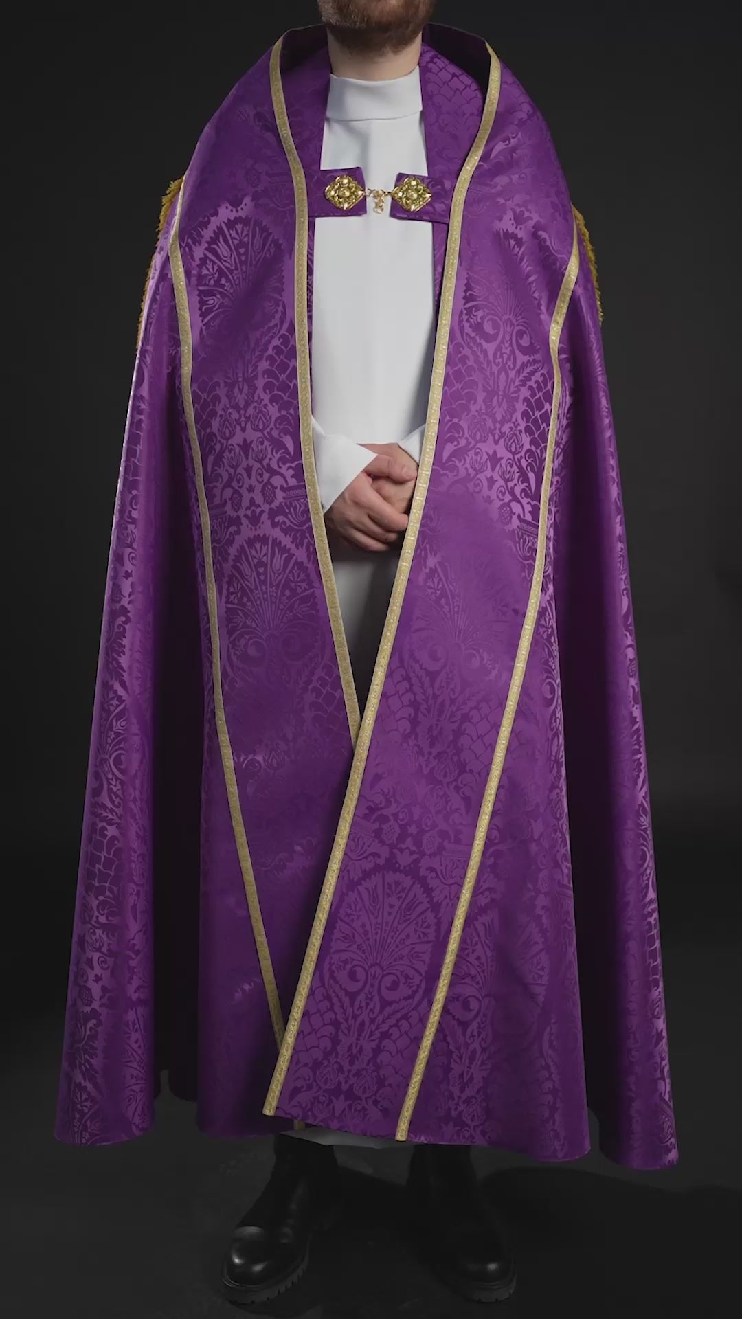 Elegante capa pluvial romana confeccionada con un tejido jacquard de alta calidad en color violeta. El material está adornado con un estampado litúrgico en relieve con un clásico motivo vegetal, lo que confiere a la vestidura un carácter solemne y noble.