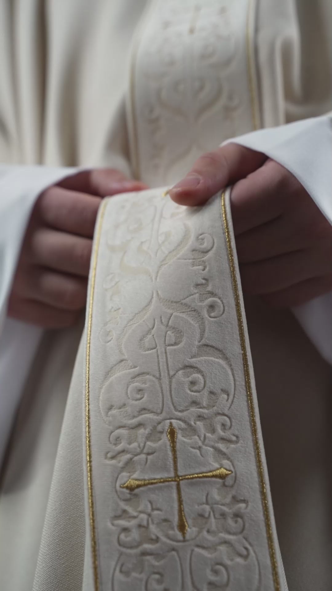 Enfeites elegantes: a faixa vertical e a gola são decoradas com intrincados bordados representando cruzes, símbolo da fé cristã. O bordado dourado contrasta subtilmente com o tecido leve, conferindo distinção à casula.