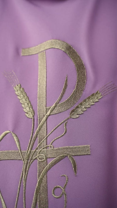 A casula é feita de tecido de alta qualidade e decorada com bordados em fio de ouro do símbolo eucarístico, representando o símbolo da PAX. As bordas da casula são rematadas com um acabamento acetinado dourado, que combina na perfeição com o símbolo da PAX bordado a dourado. A casula está também disponível em todas as cores litúrgicas.