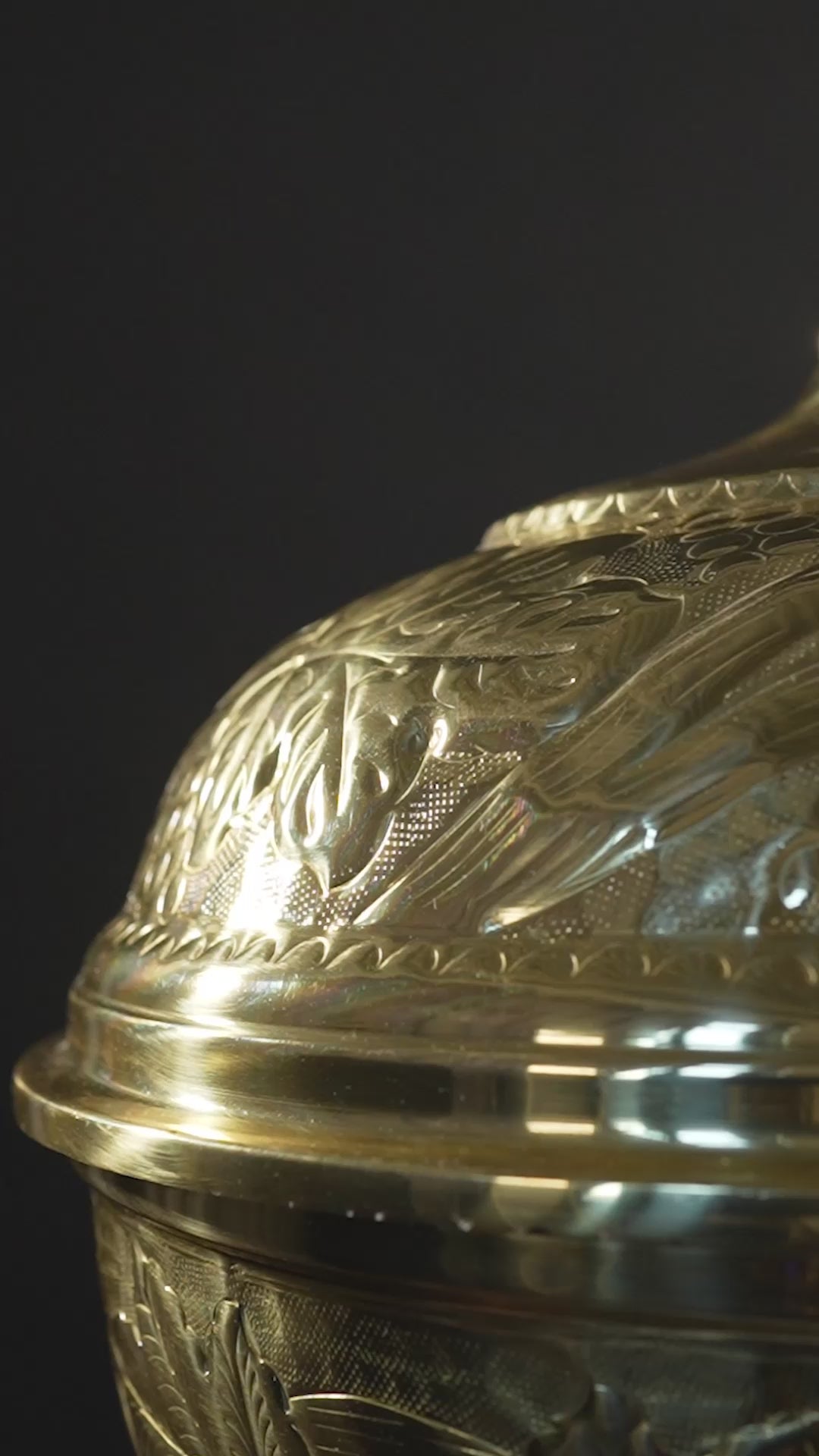 Pia batismal em latão, feita em chapa de latão estampada e decorada com motivos vegetalistas que incluem o simbolismo da videira.